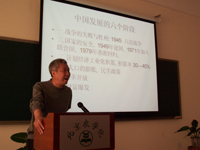 报告开始之前,系主任何忠伟对杨帆教授的到来表示了热烈的欢迎,并简单介绍了杨帆教授的简历及其研究成果。据统计,杨教授已发表论文上千篇,著作15本,总字数超过1000万字,在发表文章数量和被转载数量上,在经济学家中居全国第一。随后杨帆教授进行了近1个半小时的演讲。杨教授首先分析了非主流经济学与主流经济学十年论战过程中的两大分歧;其次,从1700年开始分析了中国崛起的历史脉络,提出了中国发展的六个阶段,即:战争的失败与胜利、国家安全、计划经济工业化积累、人口膨胀、改革开放、财富爆发;杨教授认为中国历史性崛起的原因,一方面缘于近代以来的历史性积累,另一方面来自于人口的增长。最后杨教授对中国经济未来发展做了乐观的评价,预测在2020年左右中国经济高速发展将趋于平缓。整个演讲内容丰富,充满激情,感染力强。