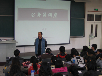 2007年10月21日上午8:30经贸系作为提高就业率的措施之一,特别邀请了曾多次参加国家公务员命题及阅卷科研工作、首都某高校系主任、国家著名公务员培训机构研究员张老师,为同学免费举行公务员考试讲座。帮助同学们提高对公务员考试的了解,以及提高我校公务员考试的通过率,促进经贸系就业率的提高。