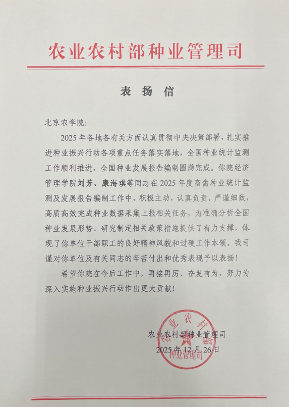 12月26日,农业农村部种业管理司向我院发来表扬信,对我院刘芳、康海琪等同志在2025年度全国畜禽种业统计监测及发展报告编制工作中的突出贡献和优异表现给予高度肯定。
