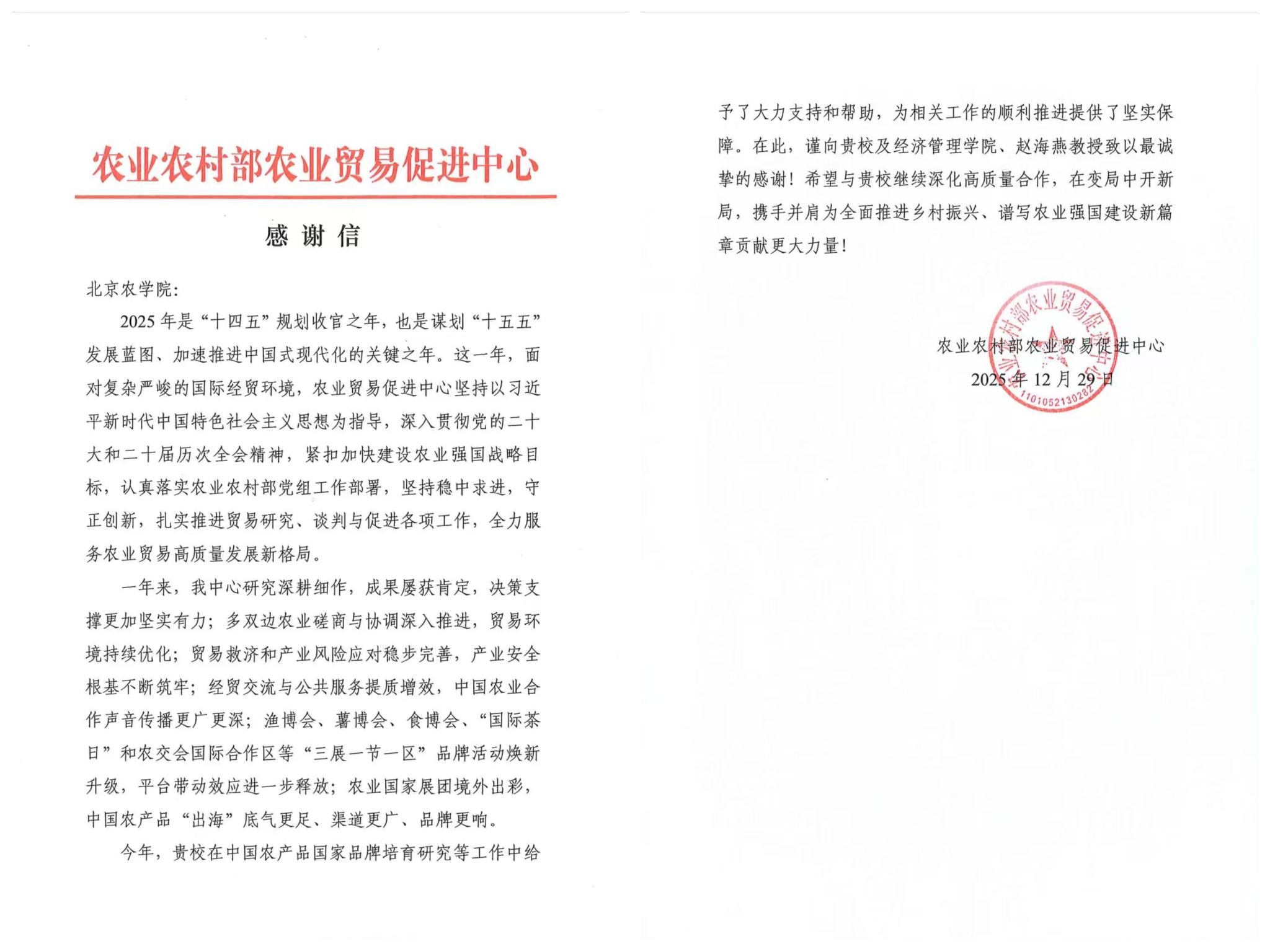 信中指出,在相关工作推进期间,赵海燕教授团队给予了多方支持与协助,为工作的顺利开展提供了坚实保障,为促进我国农业贸易高质量发展添砖加瓦。此次合作充分展现了北京农学院太阳成集团tyc234cc极强的责任担当与高效的执行能力,展望未来,农业农村部农业贸易促进中心期待与我院持续深化高质量合作,在变局中开拓新局,携手并肩共同为全面推进乡村振兴、谱写农业强国建设新篇章贡献更大智慧与力量。
