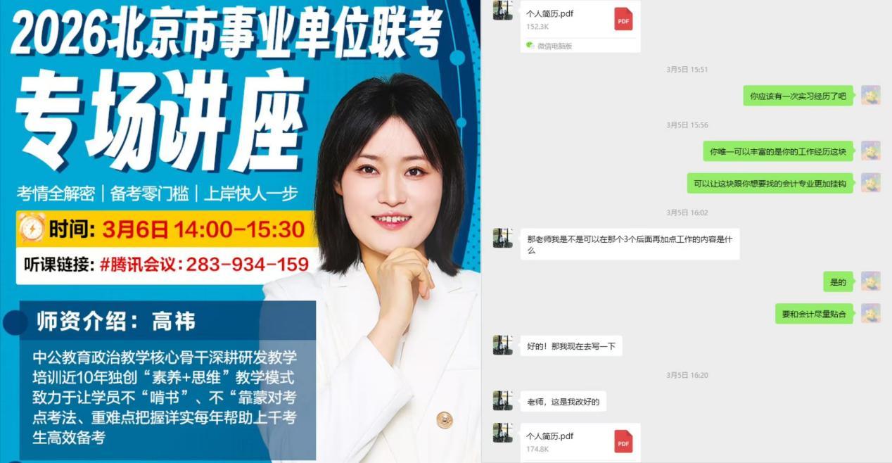 抓就业指导,增服务温度。学院全面摸排就业情况,精准把握毕业生需求,邀请行业专家开展线上事业单位备考指导,常态化开展“职业生涯与就业咨询”服务。寒假期间累计为300余名毕业生提供简历修改、就业咨询等服务。此外,学院还建立了跟踪反馈机制,根据学生意见持续优化服务,让就业指导更有温度、更具实效。会计专业的毕业生李佳润说:“老师帮我修改简历后,我收到了好几个面试邀请,之前投了好多都没回音,真的太感谢学院的就业指导服务了!”