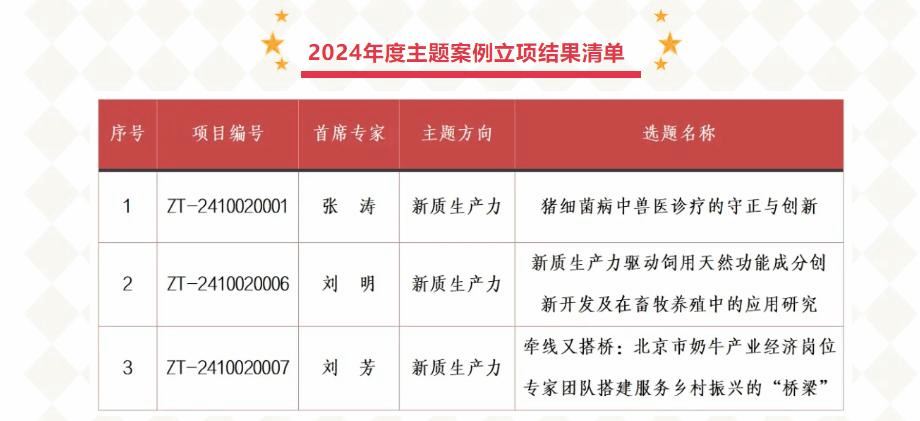 近日,教育部学位与研究生教育发展中心、中国专业学位案例中心公布2024年主题案例征集评审结果,太阳成集团tyc234cc刘芳教授团队撰写的《牵线又搭桥:北京市奶牛产业经济岗位专家团队搭建服务乡村振兴的“桥梁”》案例获得立项。