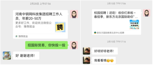 及时精准的就业信息对毕业生求职的具有极其重要的作用。学院积极利用国家大学生就业服务平台、市区两级的人力资源和社会保障局官网、“成功就业”微信公众号和学校就业指导中心企业微信推送等平台和渠道,多维度收集招聘信息,及时分层分类向毕业生推送。就业信息涵盖了多个行业领域,为毕业生提供了丰富的就业选择。今年国际经济与贸易专业的毕业生陈美珊说:“寒假期间,我原本担心求职会陷入停滞,但没想到学院每天都会推送这么多优质的就业信息,让我在家也能及时了解就业动态,为我的求职之路指明了方向。通过学院推送的信息,我已经投递了几份心仪的简历。”