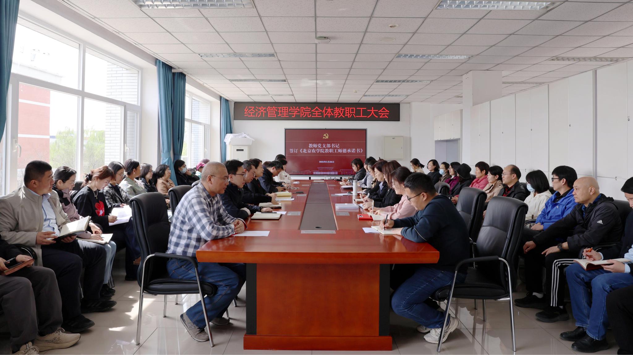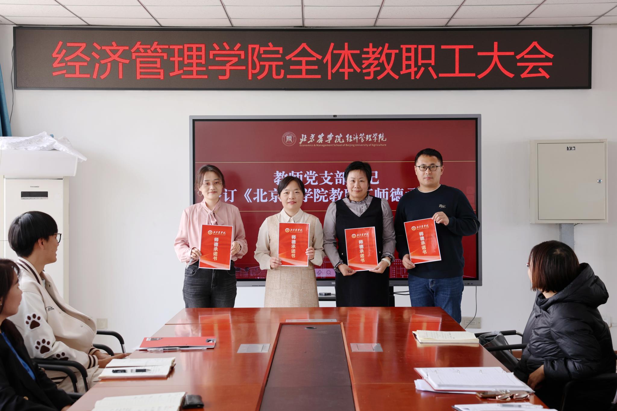 会议集中学习了学校师德承诺书的主要内容,四位教师党支部书记作为教师代表签订《北京农学院教职工师德承诺书》。